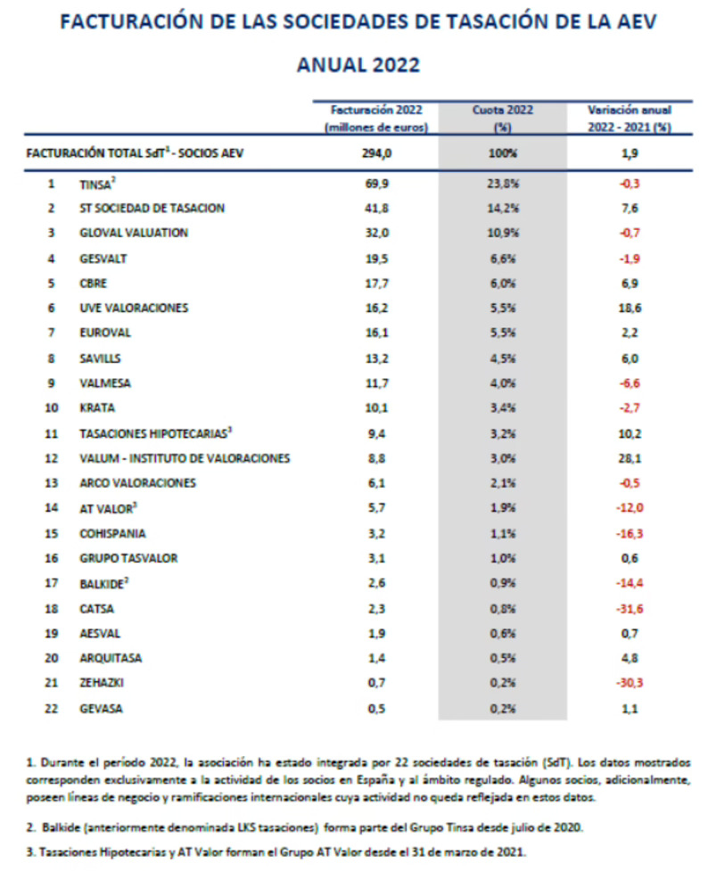 La AEV ha elaborado un ranking de las tasadoras asociadas a la organización que sitúa a Tinsa en lo alto del sector con una facturación de 69,9 M€, lo que supone una cuota del 23,8% de un sector que registró ventas conjuntas de 294 M€ en el último año. A Tinsa, le siguen en el ranking las firmas ST Sociedad de Tasación, Global Valuation, Gesvalt y CBRE.