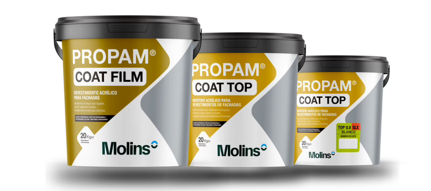 Molins Construction Solutions, nueva denominación de Propamsa, compañía dedicada a la fabricación de adhesivos cementosos y juntas, revestimientos de fachadas y SATE, morteros especiales y resinas, ha lanzado al mercado Propam Coat, una nueva gama de soluciones acrílicas de altas prestaciones. Esta gama incluye imprimaciones y morteros diseñados para ofrecer la máxima protección e impermeabilización de superficies, tanto interiores como exteriores con alta resistencia a la intemperie y en especial para aislamiento térmico por el exterior (SATE).