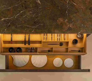 Los frentes y puertas de 35 mm de grosor, que dan nombre a la colección, están elaborados con roble teñido, combinado con un revestimiento de MDi de Inalco. El acabado Umbra de Inalco es uno de los pilares de la cocina. El característico veteado y los tonos marrones, rojizos y negros dan profundidad y generan un juego de sombras. Además de ser altamente resistente y de fácil mantenimiento, se integra con la calidez de la madera, logrando el equilibrio idóneo entre lo moderno y lo natural. La colección ofrece una amplia variedad de acabados, tanto en frentes como en superficies, adaptándose a todos los estilos. Otro aspecto distintivo es la incorporación de técnicas tradicionales de ebanistería, como son los cajones ensamblados con cola de milano