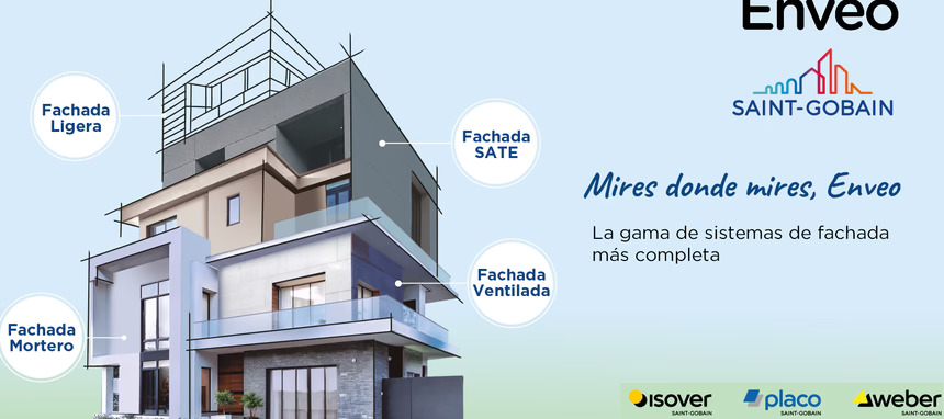 El grupo Saint-Gobain presenta su nueva marca Enveo, que engloba todas sus soluciones de fachada. La enseña ofrece una gama integral, que incluye fachadas de cerramiento completo, fachadas ventiladas, sistemas SATE y con revestimientos de mortero. Entre otras ventajas, Enveo permite centralizar el estudio de la envolvente a través de un único interlocutor, ofreciendo, además, documentación técnica completa unificada que detalla el comportamiento y las prestaciones de todas las combinaciones de los sistemas de fachada. Es también una gama con diferentes sistemas de acabados, lo que permite la personalización de la fachada. Asimismo, ofrece diferentes prestaciones técnicas, de aislamiento térmico, acústico, de resistencia al fuego, impacto y seguridad. La gama pretende maximizar igualmente la eficiencia energética, reduciendo las emisiones de CO2.