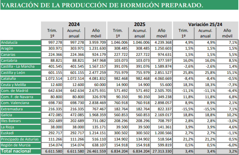 El sector del hormigón preparado ha comenzado 2025 con una evolución positiva, tras anotarse un crecimiento interanual del 3,4% en los tres primeros meses del año, según el último informe de la Asociación Nacional Española de Fabricantes de Hormigón Preparado (Anfehop). Así, la producción nacional de hormigón alcanzó los 6,83 Mm3 en el primer trimestre, en un contexto marcado por una intensa actividad de licitación pública y una recuperación progresiva del mercado. El dato confirma la tendencia positiva de los últimos nueve trimestres consecutivos, y consolida un volumen acumulado de producción de 27,3 Mm3 en los últimos 12 meses, “el nivel más alto en más de una década” apunta Carlos Peraita, director general de Anefhop.