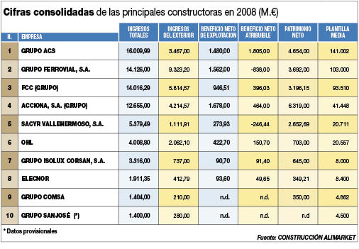 La construcción es la mayor pagana de la crisis en España. Aquí, la edificación residencial está prácticamente reducida a un tercio de la actividad de hace apenas un año y su recuperación no se espera hasta 2011. A pesar del propagandístico Plan de Inversión Local, que realmente sólo supone una subida del 15% del presupuesto de licitación de la Administración, la obra pública únicamente se mantiene estable. Además, la crisis crediticia y bursátil han dejado en un segundo plano anteriores estrategias de “pelotazos” financieros. Así, las grandes constructoras están apostando por viajar a los mercados exteriores, reforzar su negocio de servicios e invertir en las prometedoras energías renovables. Frente a la vieja idea de que la construcción viaja mal, ahora toca salir fuera.