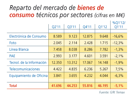 La próxima Feria IFA de Berlín, que se celebrará entre el 31 de agosto y el 5 de septiembre, volverá a traer las tendencias más avanzadas tanto en electrónica de consumo, su especialidad, como en línea blanca. El mercado europeo ha comenzado el año con una caída general del 5,1%, según los datos del primer trimestre de GfK Temax. Por líneas, electrónica de consumo continúa la tendencia de duro descenso tras un muy díficil 2011 y cayó un 16,5%. Por contra, linea blanca (-1,3%) y PAE (-2,1%) aminoran sus descensos y se situán cerca de la estabilidad. El único dato positivo provino del segmento de telecomunicaciones, que anotó un alza del 7,5% respecto al primer cuarto de 2011.
