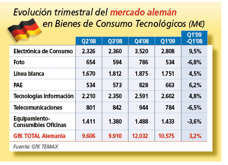 Al menos de momento, los consumidores alemanes no viven la crisis del mismo modo que otros europeos. Al menos en lo que se refiere a la demanda de bienes de consumo tecnológico. Según el informe trimestral de GfK TEMAX relativo al país centroeuropeo, durante el primer cuarto del presente año las ventas crecieron un 3,2% en términos de evolución interanual (comparado con el 1Q'08) hasta situarse en los 10.575 M€. Como es natural, si la comparativa se establece con trimestre inmediatamente precedente (el último de 2008, con campaña navideña de por medio) la evolución habría sido negativa en un 12%. Cabe destacar que los comportamientos trimestrales de cada familia analizada ha sido dispar. Así, los mejores indicadores los habrían protagonizado la electrónica de consumo (+9,5%), PAE (+6,2%), línea blanca (+4,5%) y tecnologías de la información (+4,8%). Por contra, "pinchan" negocios como la fotografía, las telecomunicaciones y el equipamiento para oficinas.
