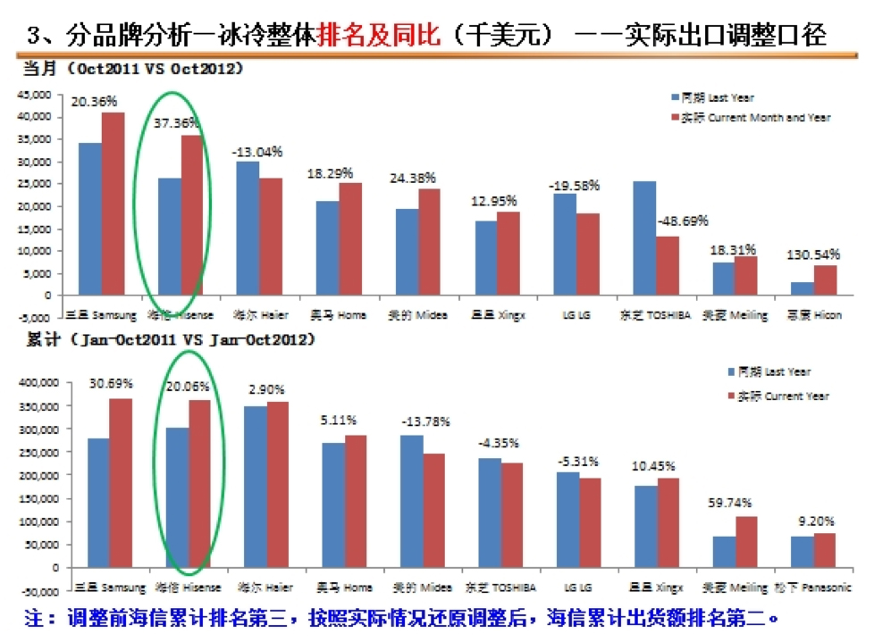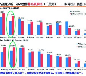 Según datos facilitados a nivel internacional por la compañía matriz, el grupo Hisense se consolidó en los 10 primeros meses de 2012 como la segunda empresa que mayores crecimientos obtuvo en la venta (incluida exportación) de frigoríficos desde China. En el cómputo acumulado (enero-octubre'2012), la marca obtuvo un crecimiento del 20,06%, el segundo mejor registro después del obtenido por Samsung (30,69%), y por delante de otros operadores como Haier (2,9%). En la comparativa mensual interanual (octubre'2011 vs octubre'2012), la compañía también habría salido bien parada al situarse directamente como el fabricante que más porcentaje de crecimiento habría experimentado en frigoríficos, concretamente un 37,36%, un incremento superior al logrado por Samsung (20,36%), según esos mismos datos.