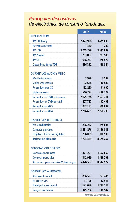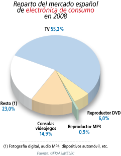 Panorama algo más sombrío sería es que se dibuja para la electrónica de consumo. Los pronósticos que maneja la asociación son coincidentes con los de otros indicadores hasta el punto de augurar una caída en términos similares a la del conjunto de 2009. Esto es, entre un 9 y un 11%. En cualquier caso, de materializarse dichas previsiones se habrían atenuado los malos datos que el conjunto de la electrónica de consumo ha venido cosechando en el primer trimestre de 2009, "donde -asegura José Pérez, director general de ASIMELEC- sólo han subido las ventas de productos como los USB y los sintonizadores TDT. Haciendo balance en este primer cuarto de año, el equipamiento de consumo se habría visto afectado por varios factores como la falta de confianza de los consumidores, la bajada de precios de los productos y "un claro deslizamiento del consumo hacia productos de bajo precio". Entre los sectores más castigados en su valor de negocio durante este trimestre figuran, según datos cruzados de ASIMELEC, el equipamiento para oficina, con una caída del 19%; el hardware informático, con un -17,3%; la telefonía móvil, con el 16,2%; o la fotografía, con el -15,6%.