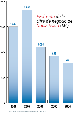La compañía Nokia Spain ha concluido el ejercicio 2008 con unas ventas de 1.497 M€, que reflejan un descenso del 18,2% en su cifra de negocio respecto al periodo 2007, cuando obtuvo 1.830 M€. Este dato sitúa a la filial española en el último puesto de la clasificación de los diez mejores mercados donde Nokia tiene presencia. Hay que recordar que en 2007 la subsidiaria ocupaba el séptimo puesto en esta lista, delante de Brasil, que ahora ha facturado 1.902 M€ con una subida del 51,3%, Indonesia (2.046 M€ y +16,6%) e Italia (1.497 M€ y -18,2%).