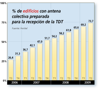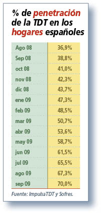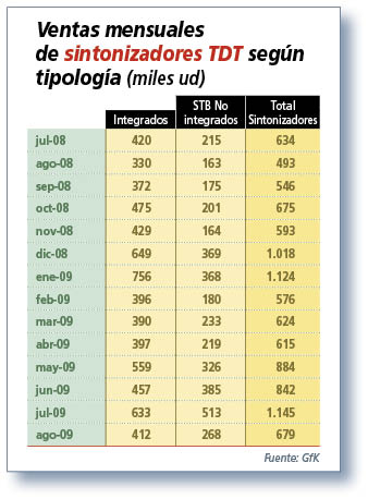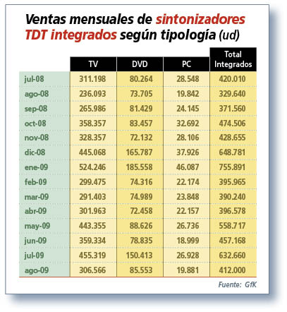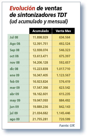 La implantación definitiva en los hogares de la TDT afronta ya su recta final. A escasos meses del apagón analógico definitivo, previsto para el 3 de abril de 2010, el nivel de equipamiento de sintonizadores en los hogares, tanto en su versión integrada en otro equipo como en las unidades externas, alcanza mes a mes cotas más elevadas. Sin ir más lejos, los últimos datos reflejados por el panel GfK y recogidos por ImpulsaTDT ya lo indican. El pasado agosto se saldó con la venta de 679.220 aparatos con TDT, lo que supuso un crecimiento interanual del 38% respecto al mismo mes de 2008 (en el que se emitieron, por otra parte, los Juegos Olímpicos). Elementos motivadores de la compra aparte, lo cierto es que según el citado observatorio de la TDT, las cifras conseguidas podrían venir de un aprovechamiento del verano “para actualizar el equipamiento televisivo en las segundas residencias”. Ello explicaría los niveles alcanzados en Andalucía y algunas Comunidades del norte del país. Esto podría explicar un incremento tan notable en un escenario económico de crisis como el actual y desafiando las tradicionales caídas estacionales del consumo en época de estío. Idea a la que habría que unir el efecto de los apagones analógicos que comenzaron a tener lugar en junio dentro de la Fase I, con su considerable efecto dinamizador en las ventas.