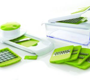 Qualimax International lanza con su marca de PAE 'Jocca' el multiplicador, es decir, un completo set con cuchillas intercambiables para rayar, laminar, trocear o cortar todo tipo de frutas y verduras sin tener que utilizar un montón de utensilios diferentes. Está compuesto por un bol de 1,2 litros, base y mango antideslizantes así como siete cuchillas intercambiables como son rallador fino, cortador en juliana, rallador, cortador, cortador en juliana fino, picador y cortador en dados. Está preparado para que al cortar los ingredientes caigan directamente en el interior del bol y cuenta con un acabado transparente. Disponible en blanco y lima, su PVP es de 29,90 €.