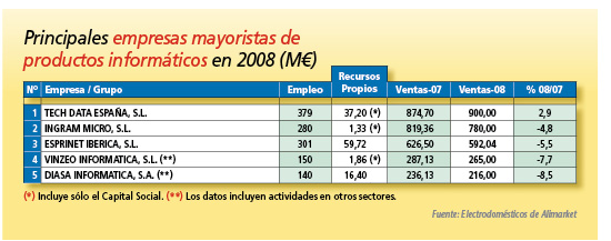 Las diez principales empresas dedicadas a la distribución mayorista de productos informáticos que operan en España abarcan el 88,8% de las ventas generadas a través de esta actividad durante el ejercicio 2008. Según el ranking elaborado por Electrodomésticos Alimarket, estas sociedades obtuvieron 3.261 M€ en el periodo analizado en relación a los 3.669 M€ totales.
