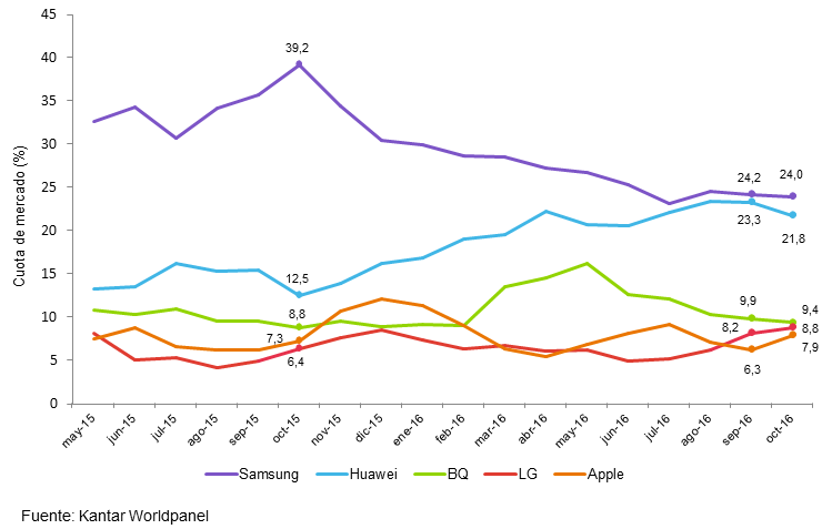 Según los últimos datos ofrecidos por la consultora Kantar Worldpanel, el grupo coreano Samsung continúa manteniendo su posición de liderazgo sobre el mercado español de smartphones (el 89,6% de todos los móviles vendidos), al menos en el periodo comprendido entre agosto a octubre de 2016. Con una cuota del 24%, la firma coreana, a pesar de reducir en octubre ligeramente su participación con respecto a septiembre (24,2%), seguiría liderando la venta de smartphone en España manteniendo una ventaja de 2,2 puntos porcentuales con respecto a su inmediato perseguidor, la china Huawei. Precisamente esta última habría reducido de forma importante su participación en octubre (21,8%) con respecto al mes anterior (23,3%). Fue precisamente en septiembre de este año, cuando la diferencia entre ambas marcas fue más estrecha: Samsung contaba con un 24,2% del mercado frente al 23,3% de Huawei. Una situación, por supuesto, nada que ver con la foto fija de hace un año. Por aquel entonces, en octubre-2015, según los datos de Kantar Worldpanel, Samsung dominó el mercado de smartphones en España de forma aplastante con el 39,2% del mercado frente a un Huawei que, aunque apuntaba maneras, controlaba un 12,5% ; esto es, 26,7 puntos porcentuales de diferencia en aquella época.