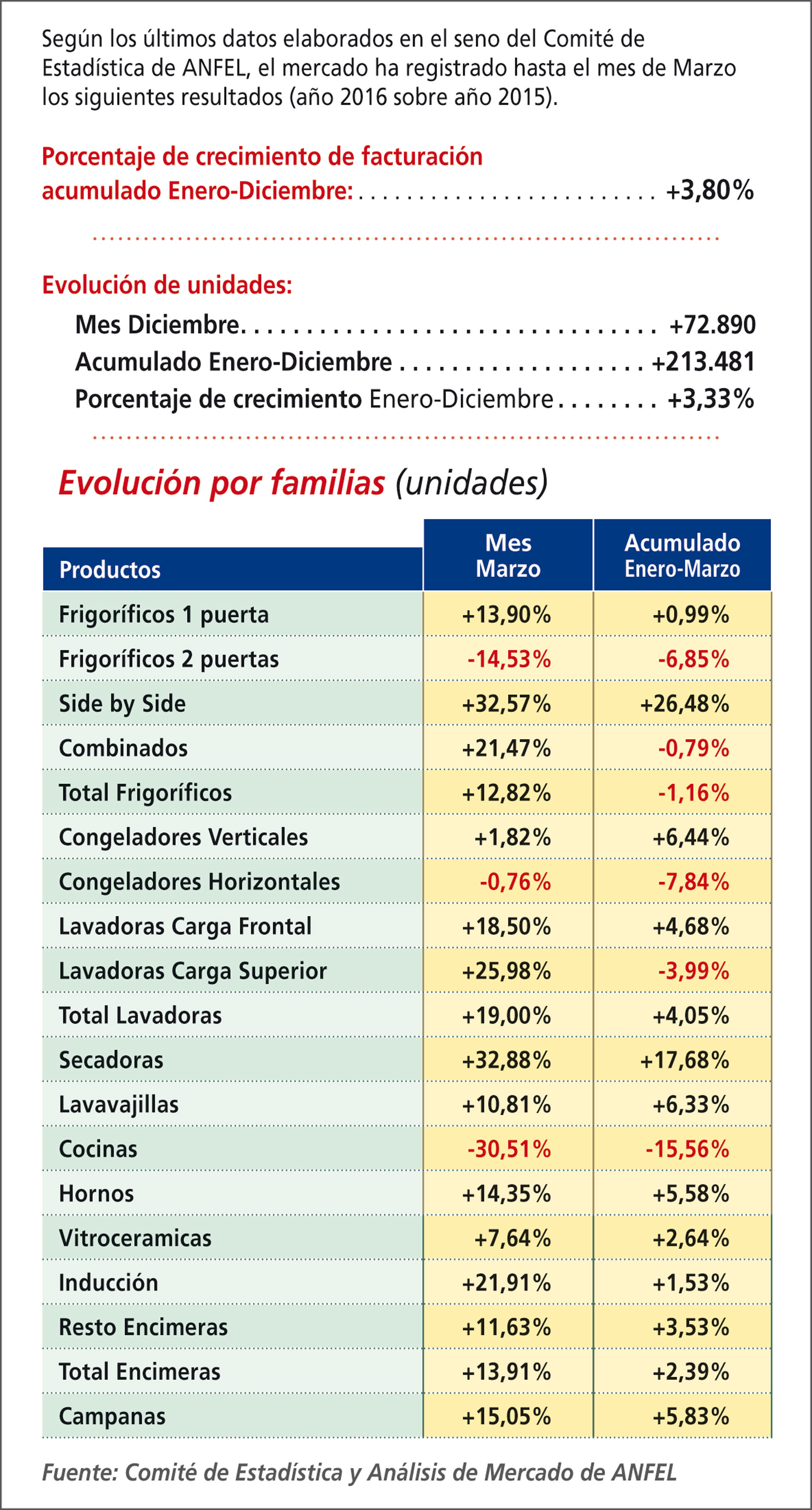 El mes de diciembre que acabamos de dejar atrás ha supuesto para el mercado de electrodomésticos de línea blanca la confirmación final de que las ventas en el mercado español durante 2016, al menos en lo tocante a entrega a tienda por parte del fabricante (sell-in), siguen afianzadas en la senda de la recuperación, aunque eso si, muy alejados de esos crecimientos de dos dígitos que vimos en 2014 y 2015. Los últimos datos facilitados por la patronal del sector Anfel reflejan un crecimiento en facturación del 3,8% (enero-diciembre) por un incremento del 3,33% en unidades vendidas, lo que supuso 213.481 aparatos más que en 2015. El mes de diciembre, siguiendo la tónica de noviembre, habría anotado 72.890 pedidos más frente al mismo diciembre de 2015. Esto serían unas 6.617.500 piezas frente a los 6.404.000 de 2015 y una facturación total, estimada por Anfel (sus 16 afiliados reunirían unas ventas en España de 1.381 M€), de 1.566 M€. Finalmente, la evolución del mercado habría sido más suave que la de los dos ejercicios anteriores tal y como se puede apreciar en el cuadro adjunto y según se recogió en el Informe anual del sector electrodomésticos de Línea Blanca en España 2016 de Alimarket.