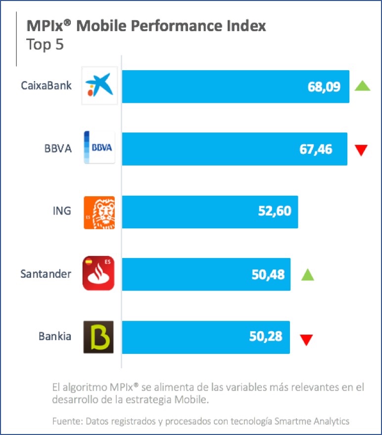 CaixaBank lidera por vez primera vez desde 2017, con una puntuación de 68,09 sobre 100, el índice Mobile Performance Index (MPIx) de Smartme Analytics, que identifica las entidades financieras mejor posicionadas en el canal móvil digital.