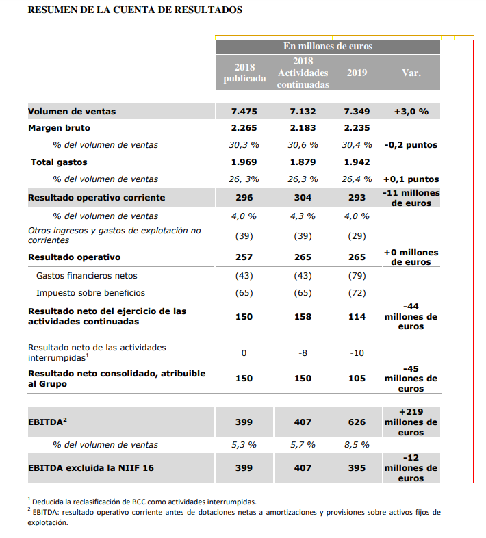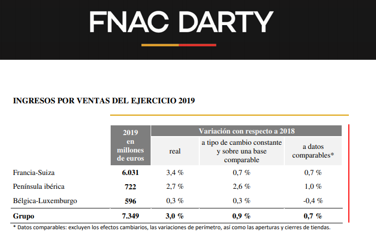 Fnac Darty presenta en un extenso comunicado, que a continuación recogemos, sus resultados anuales relativos al 2019. Lo más significativo es que en en el cuarto trimestre de 2019, en la Península ibérica, el volumen de ventas aumentó un +5,0 % de acuerdo con los datos publicados y un +2,1 % con datos comparables. La fuerza de esta actuación estuvo impulsada por la calidad de la ejecución comercial y el refuerzo del desempeño de las plataformas digitales. España muestra una resistencia sólida en un contexto de consumo átono y de intensa competencia. Portugal continua con su crecimiento constante, impulsado por el dinamismo de las ventas de telefonía, informática y servicios. En general, el volumen de ventas de Fnac Darty asciende a 7.349 M€ en 2019, lo que representa un aumento del +0,7 % con datos comparables. Estos resultados se lograron en un entorno de mercado caracterizado por acontecimientos excepcionales que afectaron repetidamente a la actividad comercial, principalmente en Francia: persistencia de las manifestaciones de los «chalecos amarillos» en el primer trimestre de 2019 y disturbios sociales a finales de año. El volumen de ventas adicional relacionado con el perímetro asciende a 159 M€ en 2019, en actividades continuadas. El tipo de margen bruto se sitúa en el 30,4%, con un descenso de 20 puntos básicos en comparación con 2018, debido principalmente al menor peso de las ventas de Navidad, afectadas por los disturbios sociales en Francia, y al efecto dilutivo técnico del desarrollo de la franquicia. El efecto del mix de productos y servicios sigue siendo ligeramente positivo gracias al impacto favorable de la integración de Nature & Découvertes. El resultado operativo corriente asciende a 293 M€. Incluye una contribución de las empresas adquiridas de poco más de 20 M€ en el ejercicio 2019. Gracias al control de costes, el margen operativo corriente de las actividades continuadas siegue siendo sólido y se sitúa en el 4,0 %. El resultado neto de las actividades continuadas es de 114 M€ en 2019 frente a 158 M en 2018. La disminución se debe principalmente al aumento de los gastos financieros, que se vieron afectados por los gastos no recurrentes por valor de 27 M relacionados con la renegociación de la emisión de bonos en 2019, y una bonificación por impuestos diferidos de aproximadamente 10 M€ en 2018. El EBITDA asciende a 626 M€, lo que representa un aumento de 219 M en relación con 2018. En 2019, el impacto de la aplicación de la norma NIIF 16 es de 231 M€. Excluida la NIIF 16, el EBITDA asciende a 395 M frente a 407 M en 2018.