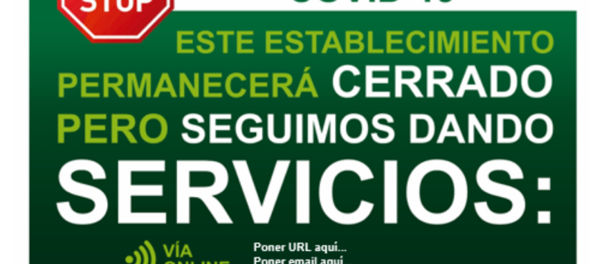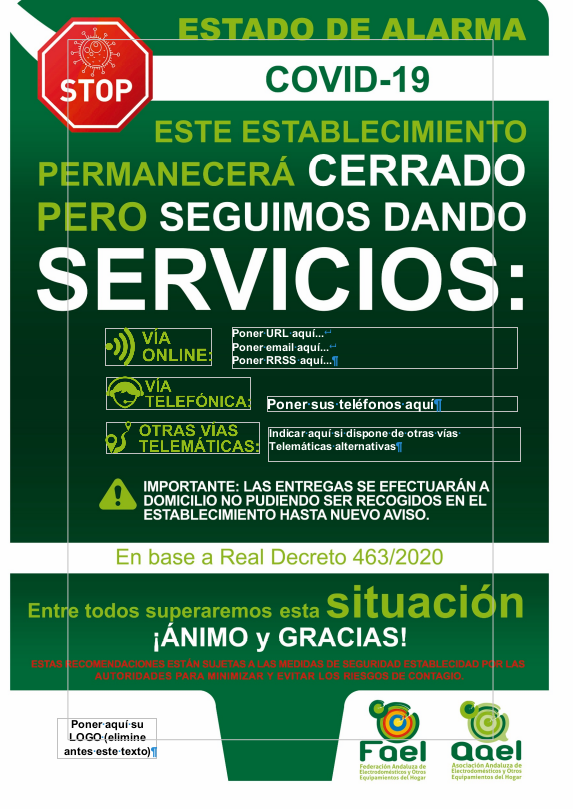 1. Continuar la actividad de venta prestando SERVICIO A DOMICILIO, vía ONLINE, TELEFÓNICA o POR CORRESPONDENCIA, pero con la tienda cerrada en cualquier caso. Los comercios que decidan acogerse a esta opción, podrán colocar en las puertas de sus establecimientos (puerta cerrada y persiana bajada) un cartel con la información de contacto (teléfono, correo electrónico, etc) en el que podrán atender a los clientes para darles servicios a domicilio. Asimismo, podrá difundir esta información a través de sus RR.SS. La entrega será realizada por la propia tienda en el domicilio del cliente. Al efecto, desde FAEL/AAEL se facilita modelo de cartelería (en formato Word) que las tiendas podrán adaptar para incluir sus datos de contacto (teléfono, WhatsApp, correo electrónico, dirección web), en los que los clientes podrán realizar los pedidos.