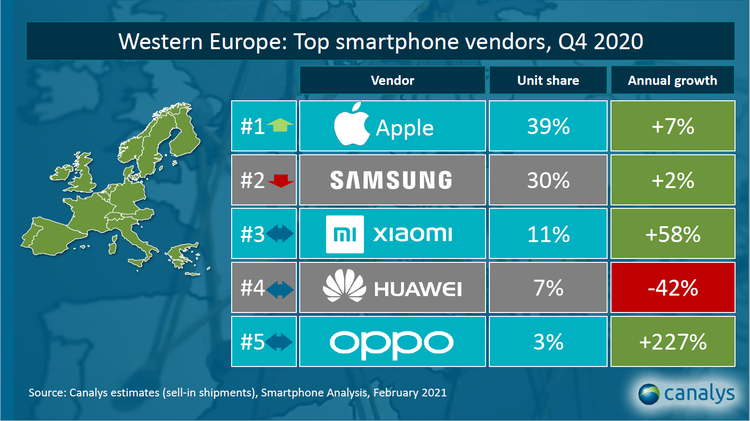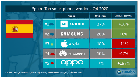 Por otra parte, Xiaomi mantiene la tercera posición entre los fabricantes de smartphones de Europa Occidental, con una cuota de mercado del 11%, según los datos de Canalys de volumen de envíos a lo largo del cuarto trimestre de 2020. Además, Xiaomi registró en ese trimestre un crecimiento interanual del 58%, siendo así la segunda compañía que más crece en esta región.