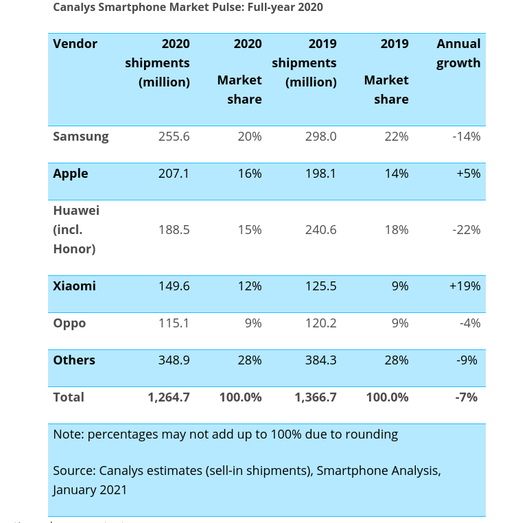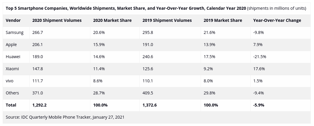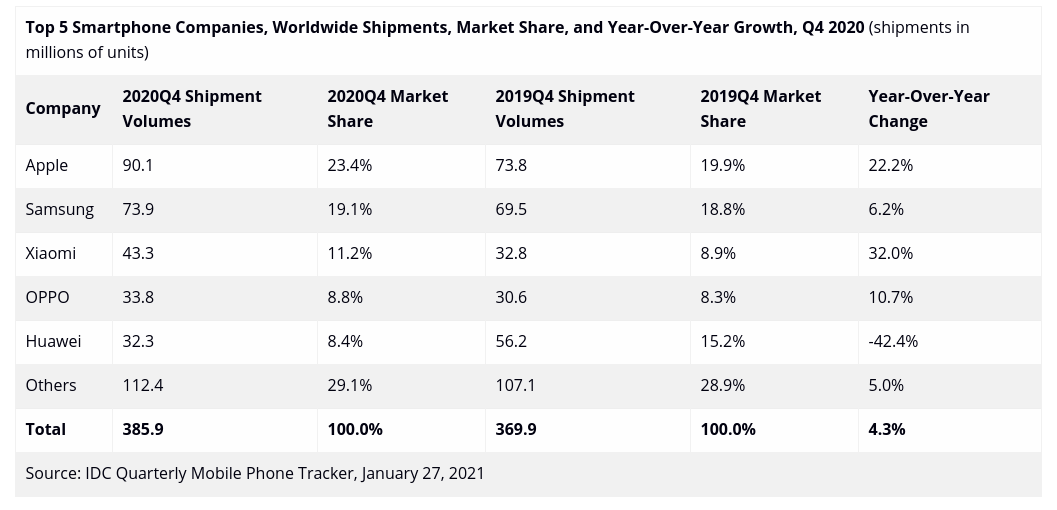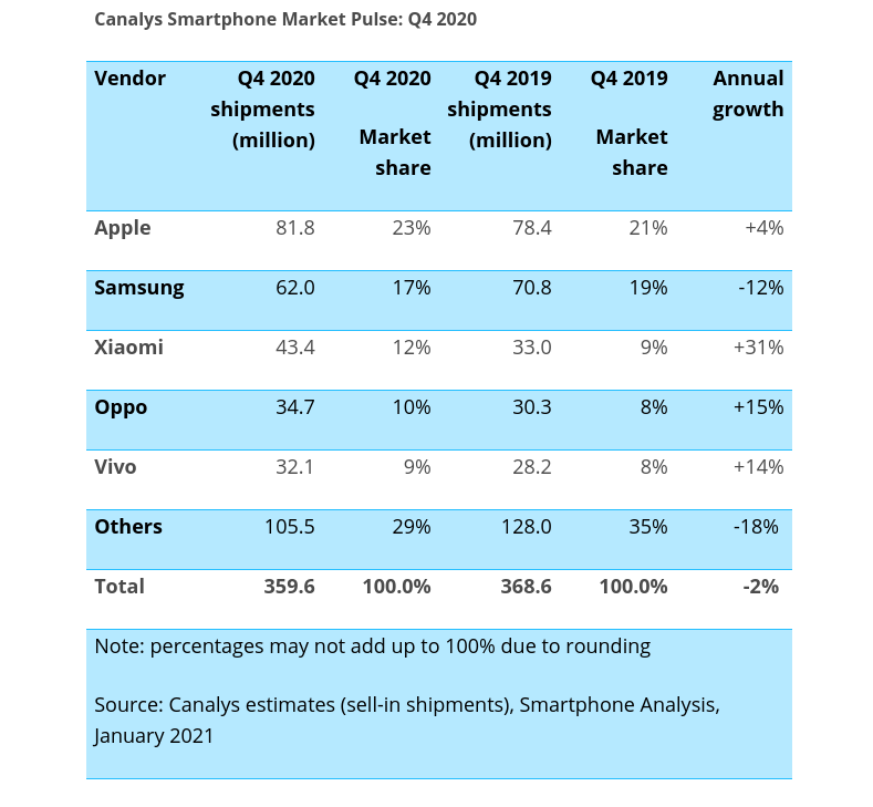Los datos del mercado global hechos públicos recientemente por Canalys e IDC, otorgan a Xiaomi una cuota de mercado durante el cuarto trimestre de 2020 del 12% y del 11,2%, respectivamente. Estos datos implican que la compañía es la que más crece a nivel mundial por volumen de envíos, ya que registró un crecimiento interanual de un 31%, según Canalys, y de un 32%, según IDC.