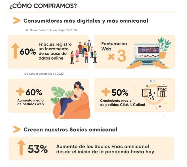 Desde el comienzo de la pandemia, en Fnac se continuó trabajando para mantener actividad con total normalidad a través de Fnac.es. Una actividad que aumentó notablemente entre el 14 de marzo y el 15 de mayo de 2020, periodo en el que todas las tiendas físicas estuvieron cerradas debido al confinamiento, Fnac.es registró un incremento del 60% de su base de datos online, y en ese mismo periodo, la facturación web se triplicó. De junio a diciembre de 2020, con todas las tiendas abiertas, los pedidos web han mantenido su tendencia al alza, con un +60% de aumento medio con respecto al mismo periodo de 2019. Hoy en día, la tendencia al alta se mantiene, y el peso de las ventas online en Fnac superan el 20% del total. El servicio Click & Collect y otros servicios de recogida en tienda han experimentado un crecimiento medio de pedidos del +50% desde junio hasta diciembre de 2020.