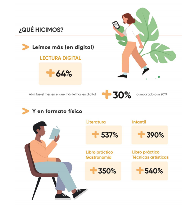 Desde el inicio de la pandemia hasta hoy, los Socios Fnac omnicanal han aumentado en un +53%. Leímos más (en digital) y en 2020 la cultura ayudó mucho a la gente a llevar mejor el confinamiento y sigue siendo clave en 2021 para hacer más llevadera la situación. Según revela el informe anual de Rakuten Kobo, líder mundial en lectura en formato digital, ha sido el año en el que la lectura digital se ha disparado entre los españoles y la pandemia ha disparado la lectura digital en España un 64%. Abril fue el mes en el que más leímos en digital, +30% comparado con 2019. A nivel general, el tiempo extra de lectura multiplicó el consumo de contenidos de mejora personal y hobbies (+98% y +81% respectivamente). Sevilla (+74%) es la ciudad de España en la que más se incrementó el consumo de este tipo de lectura, seguida de Bilbao (+70%) y Madrid (+65%). El domingo y las 21 horas fueron los momentos favoritos por los españoles para adentrarse en la lectura.Entre marzo y junio de 2020, durante el confinamiento más estricto, Fnac experimentó un incremento de sus ventas de Literatura (+537%), Infantil (+390%), Libro práctico Gastronomía (+350%) y Libro Práctico Técnicas artística (+540%).