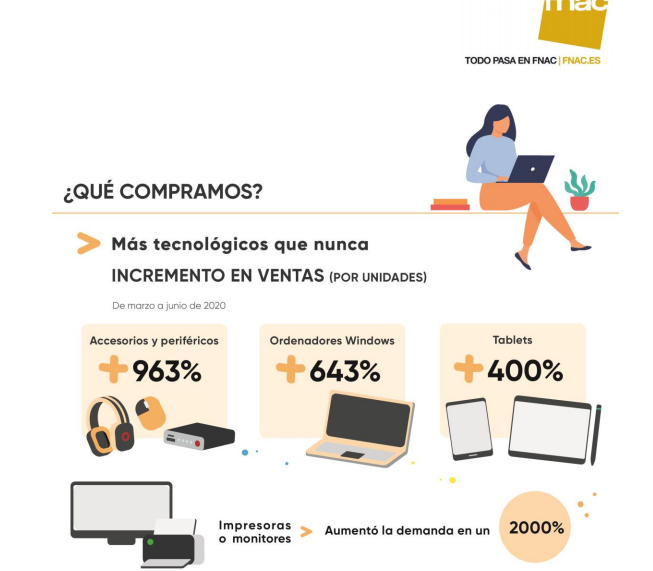 Durante el confinamiento más estricto, la necesidad de teletrabajar provocó que miles de personas montaran su propia oficina en casa, dando lugar a incrementos de venta en la web en familias como accesorios y periféricos, con un +963% en unidades frente mismo periodo de 2019, ordenadores Windows, de un +643% en unidades y tablets con casi un +400% de incremento. Además, categorías de producto, como impresoras o monitores, fueron tipos de producto especialmente relevantes para poder facilitar a niños y adolescentes el seguir con los estudios desde casa. Estos productos, que en muchos casos no se sustituían con regularidad, se convirtieron en productos de primera necesidad, aumentando la demanda durante ese mismo periodo en un 2.000% y 400% respectivamente en Fnac.es.