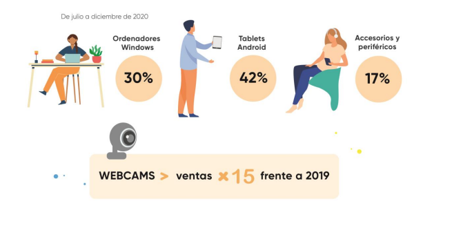Esta demanda incrementada continuó posteriormente en todas las familias de producto, creciendo la venta de ordenadores Windows un 30% de julio a diciembre, un 42% en las tablet Android y un 17% en accesorios y periféricos, con monitores e impresoras creciendo fuertemente. Sin embargo, como dato curioso, la familia de productos que más se ha disparado en ventas durante el confinamiento y el postconfinamiento ha sido webcams, debido a las reuniones virtuales y quedadas online, impulsando sus ventas por 15 frente a 2019.