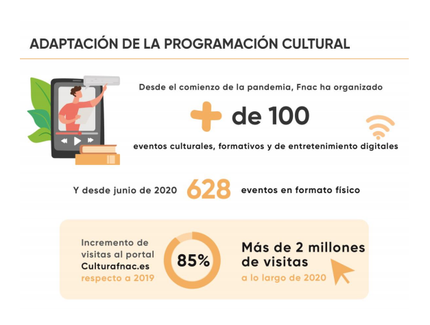 Desde el comienzo de la pandemia, Fnac ha organizado más de 100 eventos culturales, formativos y de entretenimiento digitales, con el firme propósito –seña de identidad de la marca- de difundir la cultura y hacerla accesible al mayor número de personas, además de ayudarles a entretenerse, desconectar o relajarse en unos momentos tan difíciles. Durante la desescalada se produjo la reapertura de las tiendas físicas y con ellas, la vuelta de los eventos presenciales. Una vez se pudo retomar parte de la actividad cultural, Fnac estableció un cuidado protocolo para adaptarse a las medidas de seguridad sanitarias y evitar aglomeraciones. Control de aforos, circuitos de entrada y salida, restricción de horarios y registro previo de forma telemática son algunas de las medidas adoptadas en los 628 eventos (presentaciones de libros, sesiones de firmas, charlas, proyecciones, conciertos, talleres, etc.) en formato físico que se han realizado desde junio de 2020. Fnac ha compaginado la realización de determinados eventos en formato físico (con todas las medidas de seguridad y aforos adecuados a cada momento) con los eventos online, que se mantienen regularmente en su programación. El aumento de la venta a través del canal online también se ha visto reflejado en el aumento de visitas a Cultura Fnac, el apartado en Fnac.es dedicado a la prescripción de producto a través de reseñas, entrevistas, blogs de autores, vídeos de Expertos Fnac, etc. El incremento de visitas al portal respecto a 2019 fue de un 85%, registrando más de 2 millones de vistas a lo largo de 2020.