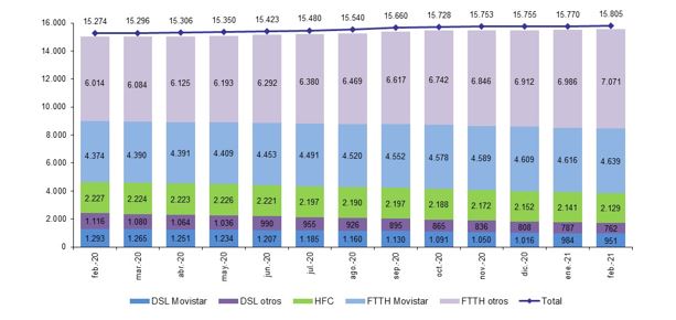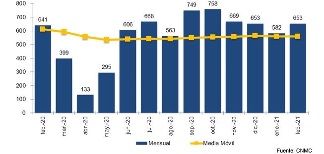 Durante el segundo mes de 2021 se perdieron líneas, tanto en telefonía móvil como en fija. En móvil, el parque de líneas se redujo en 27.682 líneas. El mes cerró con una cifra de 54,8 M de líneas móviles, lo que supone un 0,2% más que hace un año. Las líneas M2M se situaron en 7,85 M de líneas, un 14,3% más que hace un año. Los tres principales operadores representaron casi el 75,4% del total de líneas móviles del mercado.