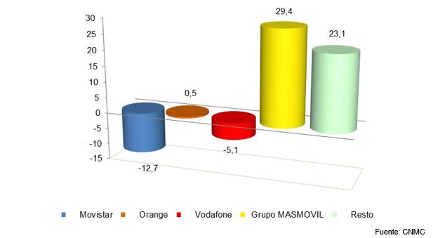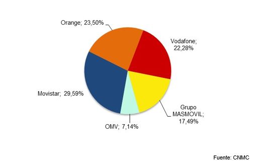 El 81,8% del total de líneas se concentra en los tres principales operadores: Movistar, Orange (incluido Jazztel) y Vodafone (incluido Ono).