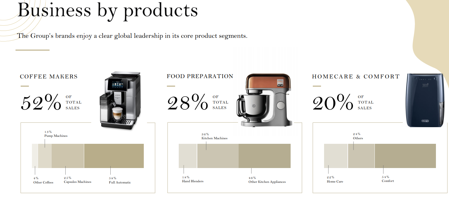 El Grupo DeLonghi es uno de los principales actores del negocio del pequeño electrodoméstico dedicado al mundo del café, cocina y preparación de alimentos, aire acondicionado, calefacción y cuidado a domicilio. Cotizadesde 2001 en la Bolsa de Valores de Italia MTA, está presente en más de 120 mercados alrededor del mundo y cuenta con más de 9.000 empleados. Sus marcas son DeLonghi, Kenwood, Braun, Ariete, Nutribullet y Magic Bullet, estás dos últimas adquiridas en 2020.
