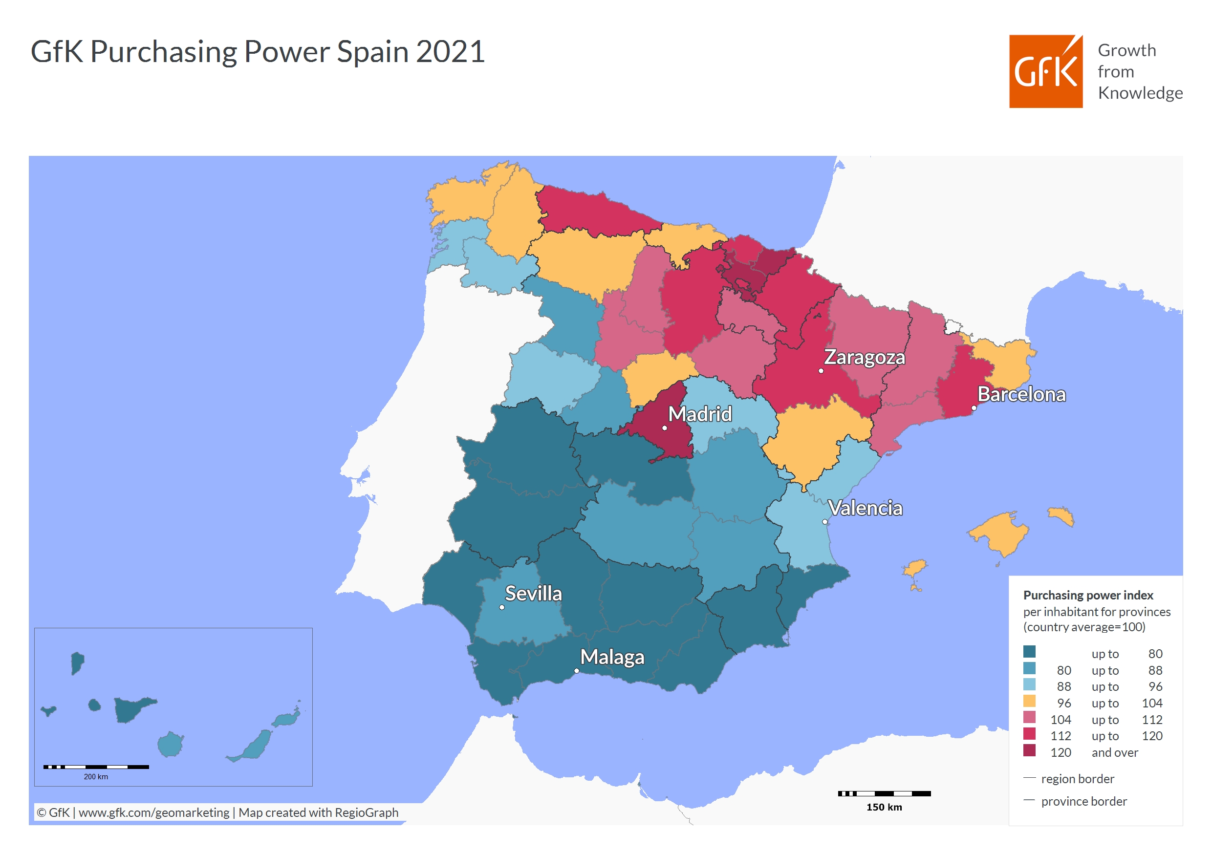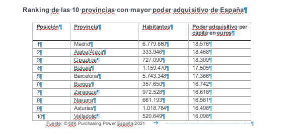 En España, las cinco provincias con mayor poder adquisitivo son, en orden descendente: Madrid, Araba/Álava, Gipuzkoa, Bizkaia y Barcelona.