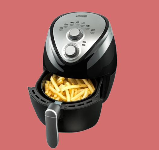 En primer lugar Air Fryer en sus dos versiones, con capacidad de 2,5 litros (0,8 Kgs) y 5,5 L. (1,5 kgs). Con un simple gesto escoges el tipo de alimento que quieres cocinar (carne, pescado, verduras...). Con esta freidora cocinarás los alimentos con un 65% menos de grasas. Además, asa, fríe y hornea sin olores. Con una potencia de 1.300 W (2,5L) y 1.800 W (5,5 L), su recubrimiento interior antiadherente lo hace muy fácil de limpiar y la cesta puede ponerse en el lavavajillas. El termostato es regulable de 80ºC hasta 200ºC e incorpora un temporizador de hasta 30 minutos.