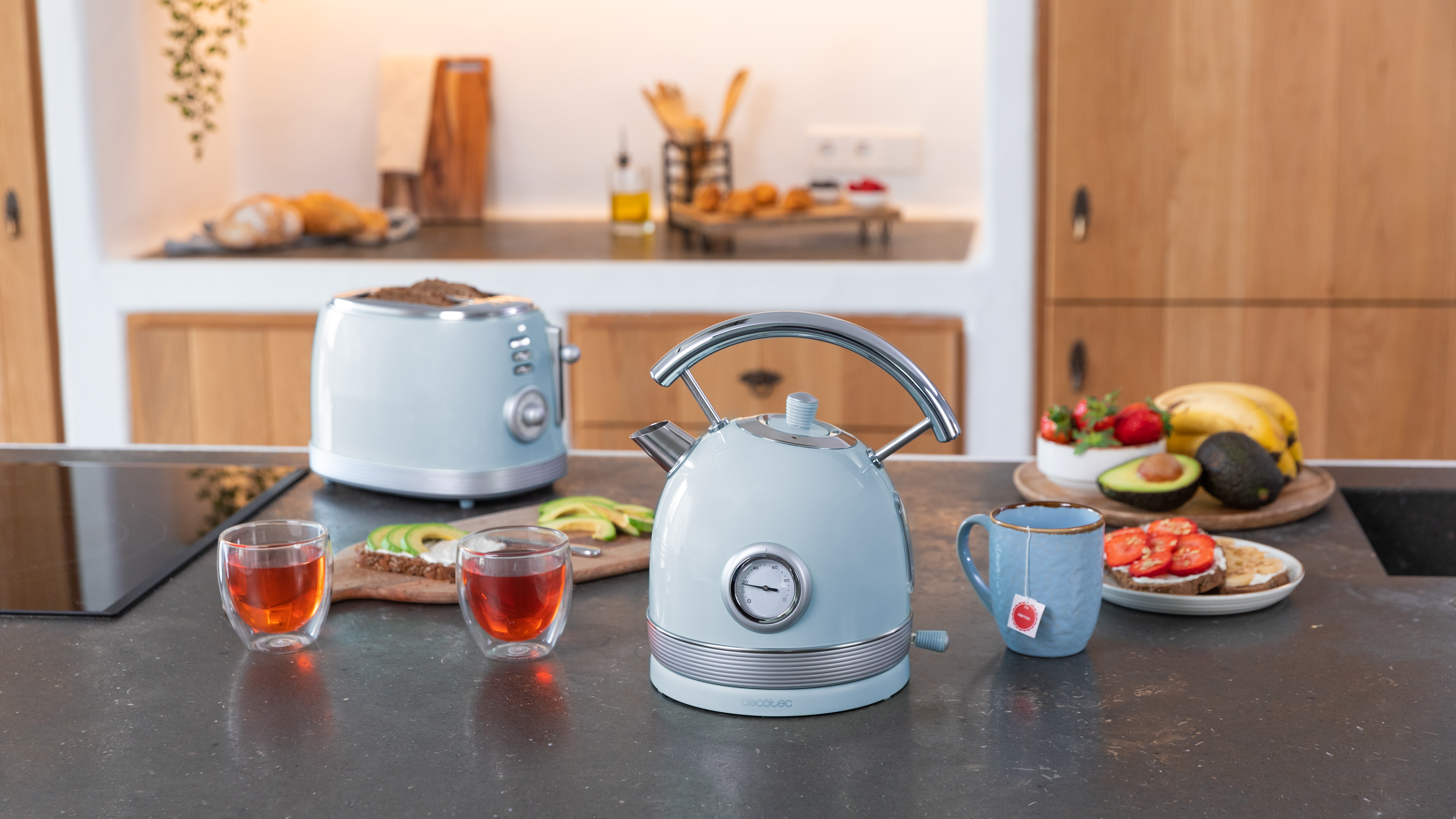 Los hervidores de agua eléctricos, Thermosense 420 Vintage, también de estilo retro y a juego con las tostadoras, tienen 1,8 litros de capacidad y 2.200 W para una ebullición sin esperas. Disponen de medidor de temperatura integrado que permite ver en todo momento a qué temperatura se encuentra el agua, té o infusión, un diseño elegante de acero inoxidable disponible en cuatro colores, base con giro 360° que permite el uso tanto a diestros como a zurdos, sistema de seguridad que se apaga automáticamente cuando el agua hierve de acero inoxidable resistente a la corrosión, duradero, saludable y seguro sin BPA y luz indicadora de funcionamiento.