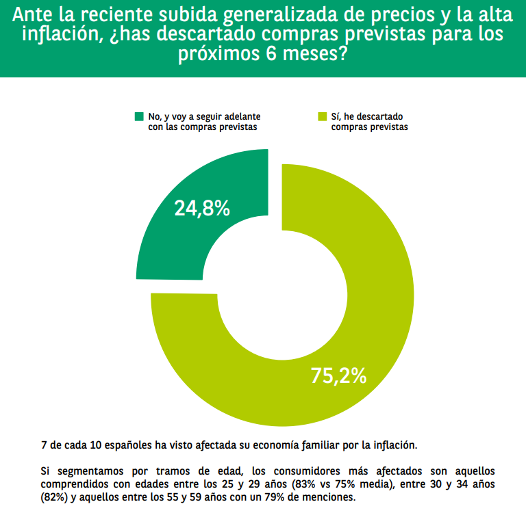 Según el estudio del Observatorio Cetelem, unidad de estudios de BNP Paribas Personal Finance, los consumidores más afectados son el segmento de edad comprendido entre los 25 y 29 años. Para el 83% de los compradores de estas edades, las últimas noticias sobre la inflación, han provocado cancelaciones en sus compras previstas para los próximos 6 meses.
