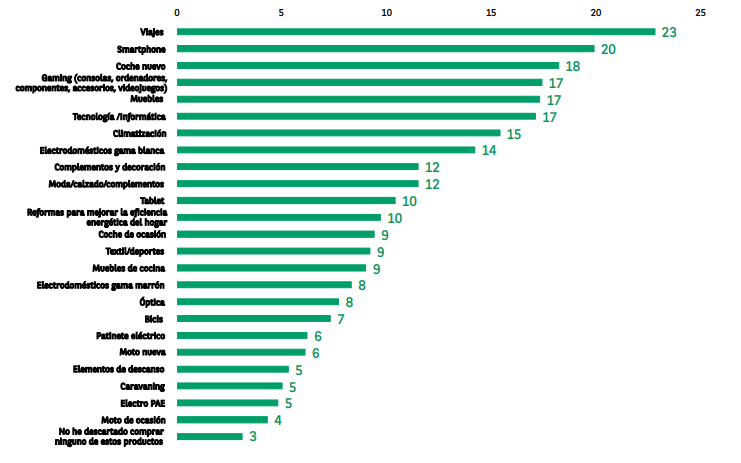 Si analizamos por sectores, el top 3 de productos que los consumidores españoles descartarían de sus compras previstas como consecuencia del avance de la inflación son: viajes (23%), smartphones (20%) y vehículos nuevos (18%). En el caso de los viajes, los consumidores más afectados han sido aquellos con edades comprendidas entre los 50 y 54 años con un 35% de menciones frente al 23% de la media.