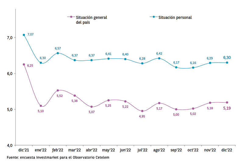 Esta disminución de la valoración general, tanto personal como del país, experimentada a principios de 2022, estaría causada por el inicio del conflicto bélico por parte de Rusia en Ucrania y de los efectos de dicho conflicto en la economía.