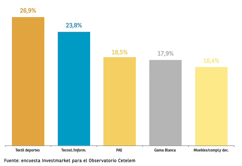 El top 5 de intención de compra para los próximos meses son textil/deportes, con un 26,9%; tecnología e informática, con un 23,8%; pequeño electrodoméstico, con un 18,5%; productos de gama blanca, con un 17,9%; y muebles, complementos y decoración, con un 16,4%.