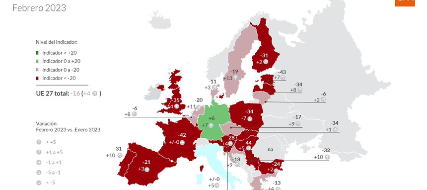 Aunque las expectativas económicas de los europeos mejoran por quinto mes consecutivo, siguen estando en valores muy negativos. En el total de la UE este indicador crece cuatro puntos en febrero, situándose en los -16 puntos. Los niveles más bajos se registran en Hungría (-44), Estonia (-43), Francia (-42) y Eslovenia (-38), mientras que únicamente Alemania (6) presenta valores positivos. El resto de 26 países analizados registran valores en cero, como el caso de Italia, y por debajo de ese valor.