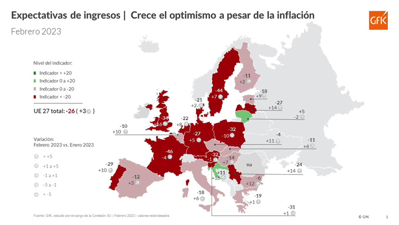A pesar de que la inflación está muy por encima del objetivo del 2% por parte del BCE, el optimismo en las expectativas de ingresos también mejora por quinta vez consecutiva. El valor para la UE aumentó 3 puntos hasta los -26 puntos. Especialmente Croacia (11), Lituania (5), República Checa (-4) y Bulgaria (-6) reportaron los niveles más altos de febrero. Los aumentos más destacados, comparado con el mes previo, se produjeron en Reino Unido, Croacia, Letonia y Bulgaria.