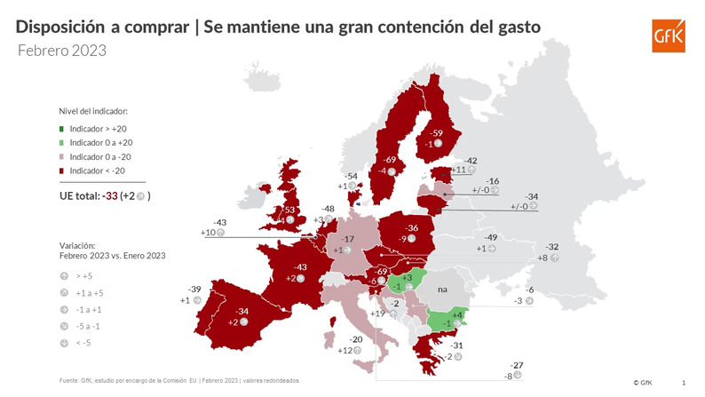 En general, la disposición a comprar es de los tres indicadores el que registra un dato más negativo. En los 27 países de la UE aumentó 2 puntos hasta sumar -33 puntos. Los países con mejores valores son Bulgaria (4), Hungría (3) y Croacia (-2), mientras que Austria y Suecia (ambos con -69), Luxemburgo (-64), Finlandia (-59) y el Reino Unido (-53) se situaron a la cola.