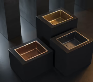 Estos fregaderos ofrecen un diseño vanguardista basado en las líneas puras y en los recubrimientos PVD, una capa de color que se obtiene por la evaporación del metal y su adherencia a la superficie de acero inoxidable que incrementa la dureza de este material. Las numerosas pruebas de resistencia a las que han sido sometidos aseguran su durabilidad y calidad.