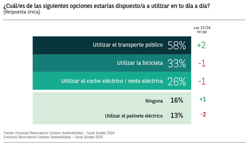 El 63% de los españoles considera importante o muy importante la movilidad sostenible. Por ello, 7 de cada 10 considera importante o muy importante que las ciudades tomen acciones para regular y mejorar la movilidad urbana sostenible y la inversión de instituciones públicas en medios de transporte ecológicos. Entre las alternativas de movilidad sostenible, el 58% afirma desplazarse en transporte público. Le sigue el 33% que afirma utilizar la bici como medio de transporte, un 26% que se desplaza con coche o moto eléctrica y un 13% que prefiere el patinete eléctrico. Un 16%, por el contrario, no se muestra partidario de desplazarse con ninguna de estas opciones.
