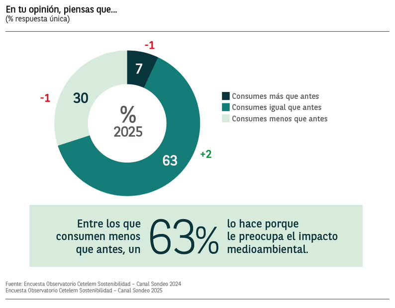 De acuerdo con el estudio, 9 de cada 10 consumidores está preocupado o muy preocupado por el cambio climático, y un 91% está dispuesto a tomar medidas al respecto. Así, el 43% de los españoles afirma tener en cuenta la sostenibilidad en los productos y servicios que compra, con un 35% de ellos que declara hacerlo casi siempre y un 9% que asegura tenerlo en cuenta siempre. Otro 44%, por su parte, afirma considerarlo a veces. El 63% de los españoles declara realizar el mismo consumo ahora que antes, frente al 7% que declara haberlo aumentado.