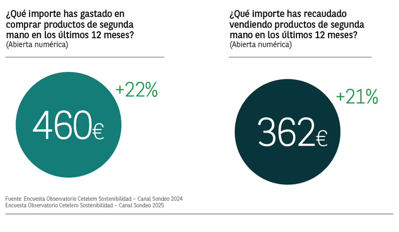 Las compras de segunda mano son cada vez más populares entre los españoles, con 7 de cada que 10 que ha realizado compras de este tipo alguna vez. El 44% declara comprar de segunda mano alguna vez al año, mientras que un 26% lo hace alguna vez al mes y el 3% semanalmente. Un 27% declara no hacerlo nunca. La mayoría de las compras de segunda mano, sin embargo, no se realizan por conciencia sobre la sostenibilidad, sino que es el factor económico el que más prima. El 65% afirma que ahorra dinero, un 27% declara que le permite acceder a más productos y más baratos y un 25% afirma que le gusta ganar dinero comprando y vendiendo productos de segunda mano. Solo un 27% asegura comprar productos de segunda mano para preservar los recursos y el medio ambiente. Así, el gasto medio en compras de segunda mano se sitúa en 465 €, lo que supone un 22% más respecto a 2024. Entre quienes han vendido productos de segunda mano, el importe medio recaudado es de 362 €, un 21% más.