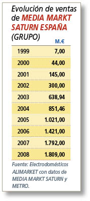 En todo el conjunto de 2007, MEDIA MARKT SATURN inauguró en España un total de nueve establecimientos que aportaron a su estructura 31.350 m2 de sala de venta nueva neta. Ya entrado 2008, la filial del grupo alemán, continuando con el ritmo de aperturas al que nos tiene acostumbrados, incorporó otros nueve centros: dos “Saturn” con 10.800 m2 y siete “Media Markt” que sumaban 23.950 m2. Pero ¿por qué este repaso cronológico? Sencillamente porque de no haber abierto todos estos centros el operador alemán no habría podido finalizar el pasado 2008 con una facturación, consolidada según METRO, su matriz en última instancia, de 1.809 M€. O lo que es lo mismo, un tibio crecimiento del 0,95%.