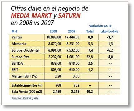 En cualquier caso, la evolución seguida por Media Markt Saturn pasa por los mismos matices que el mercado español. La compañía cerró 2008 con unas ventas de 18.993 M€ o lo que es lo mismo, un 8,9% más que el año anterior. No obstante, las ventas a superficie comparable habrían retrocedido un 1,7% como consecuencia de las dificultades económicas que atraviesan muchos de los países en que está instalado. Y la situación en Europa Occidental es de las más preocupantes, por efecto como decíamos de España e Italia. En conjunto las ventas comparables se redujeron de forma drástica un 6,2%. Tan sólo las nuevas aperturas permitieron un crecimiento del 7,4% hasta los 8.091 M€. Bien distinta sería su evolución en Europa del Este. Con Polonia al frente, la facturación del grupo en esta región no sólo aumentaba un 32,8% (2.232 M€) por estar en plena fase de expansión; su “like-for-like” era un 4% superior.