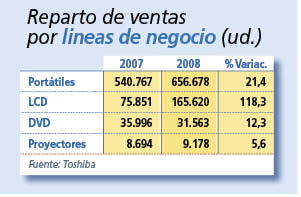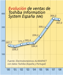 Nuestra facturación conjunta se reduce un 2% pero crecemos un 21% en ventas unitarias de portátiles y un 118% en pantallas LCD. La verdad, es una pena.” Con estas palabras Alberto Ruano, director general de la compañía no quería dejar pasar por alto la endémica problemática de la caída de precios del mercado. Durante el último año Toshiba comercializó 656.678 portátiles (378.237 en España, el resto en Portugal), con un crecimiento en unidades del 21,4%. Asimismo, sus ventas de pantallas LCD ascendieron exponencialmente (118,3%) hasta las 165.620 ud mientras que los proyectores mantuvieron un ritmo estable (9.178 equipos, +5,6%). Pese a ello, y pese a que su recién nacida división de accesorios y dispositivos de convergencia daba un estirón (+47,9%) hasta los 18,8 M€, la facturación conjunta no despegó todo lo deseable. “¿Cómo lo vemos? –prosigue Ruano-. Estamos muy contentos. Mientras el mercado decrece un 20% nosotros sólo lo hemos hecho un 2%”. En cualquier caso, que el sector esté a la baja no habría sido el único factor a tener en cuenta ya que un problema de planificación en las entregas impidió aproximarse a los objetivos marcados de 380 M. “Se trata de proyectos que habíamos ganado en la última parte del ejercicio pero que nuestras fábricas han tenido que posponer las entregas para mayo-junio. De no ser por ello hubiéramos llegado al objetivo”.