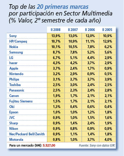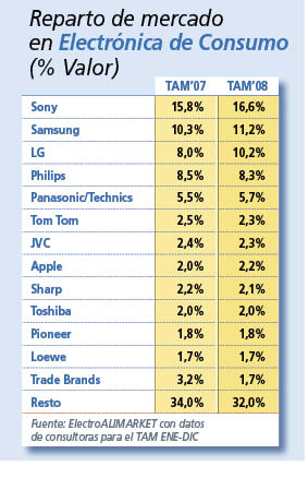 Cuando la crisis termina, una parte sale perdiendo pero siempre hay una minoría que sale ganando”. Con esta frase Pedro Navarrete, director general de Sony España, expuso cuales deben ser los retos de su compañía a lo largo de este complicado ejercicio. En un entorno de negocio español valorado en 11.250 M€, que no sólo incluiría la electrónica de consumo tradicional sino videojuegos, telecomunicaciones e informática, todo el producto ‘Sony’ (ver cuadro) aglutinaría una cuota del 14%. “Se trata de la participación más alta de los últimos nueve años”, explicó Navarrete, “pero es que además seguimos aumentando esa participación lo que nos coloca en una posición muy sólida de cara al futuro. En la última campaña de Navidad incluso hemos crecido un 16-17% ”. Y ahí está el quid de la cuestión. Las perspectivas de la compañía para este ejercicio auguran una merma de este macrosector del 10-11% (similar al experimentado en 2008). Con todo, seguiría siendo el cuarto año en facturación de toda la historia, “bajamos por segundo año consecutivo pero el valor absoluto del mercado es todavía importante”. Y lo es porque la estructura interna ha cambiado sustancialmente: más de la mitad del negocio (52%) se congrega en televisores, algo que no sucedía desde hacía muchos años.