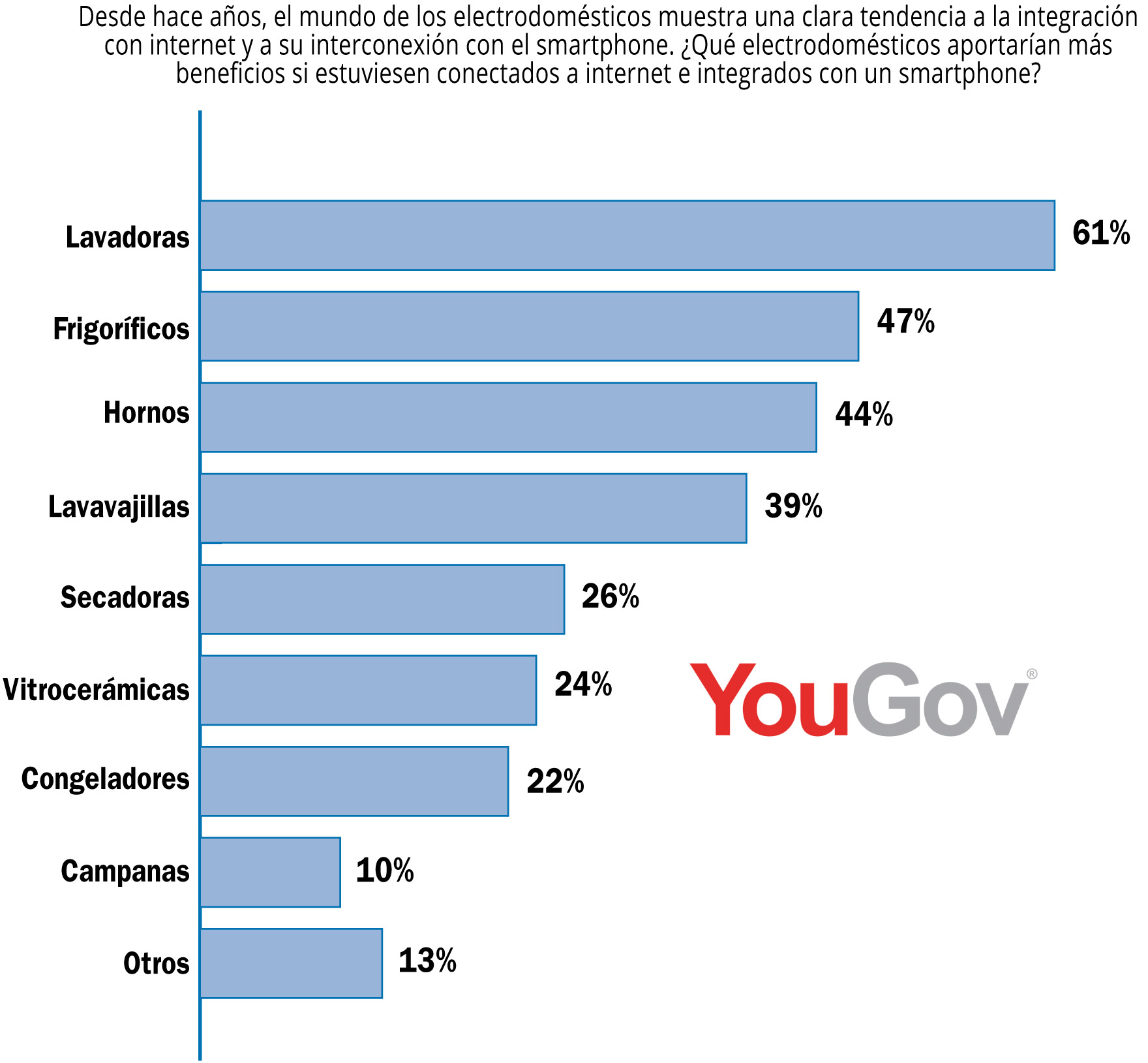 Por otra parte, preguntados sobre qué electrodomésticos consideran que puede aportarles más beneficios si fuese “conectable”, la mayoría de los consultados sitúan las lavadoras (61%), los frigoríficos (47%) y los hornos (44%) como los aparatos donde más perciben esta conectividad con internet y/o un smartphone.