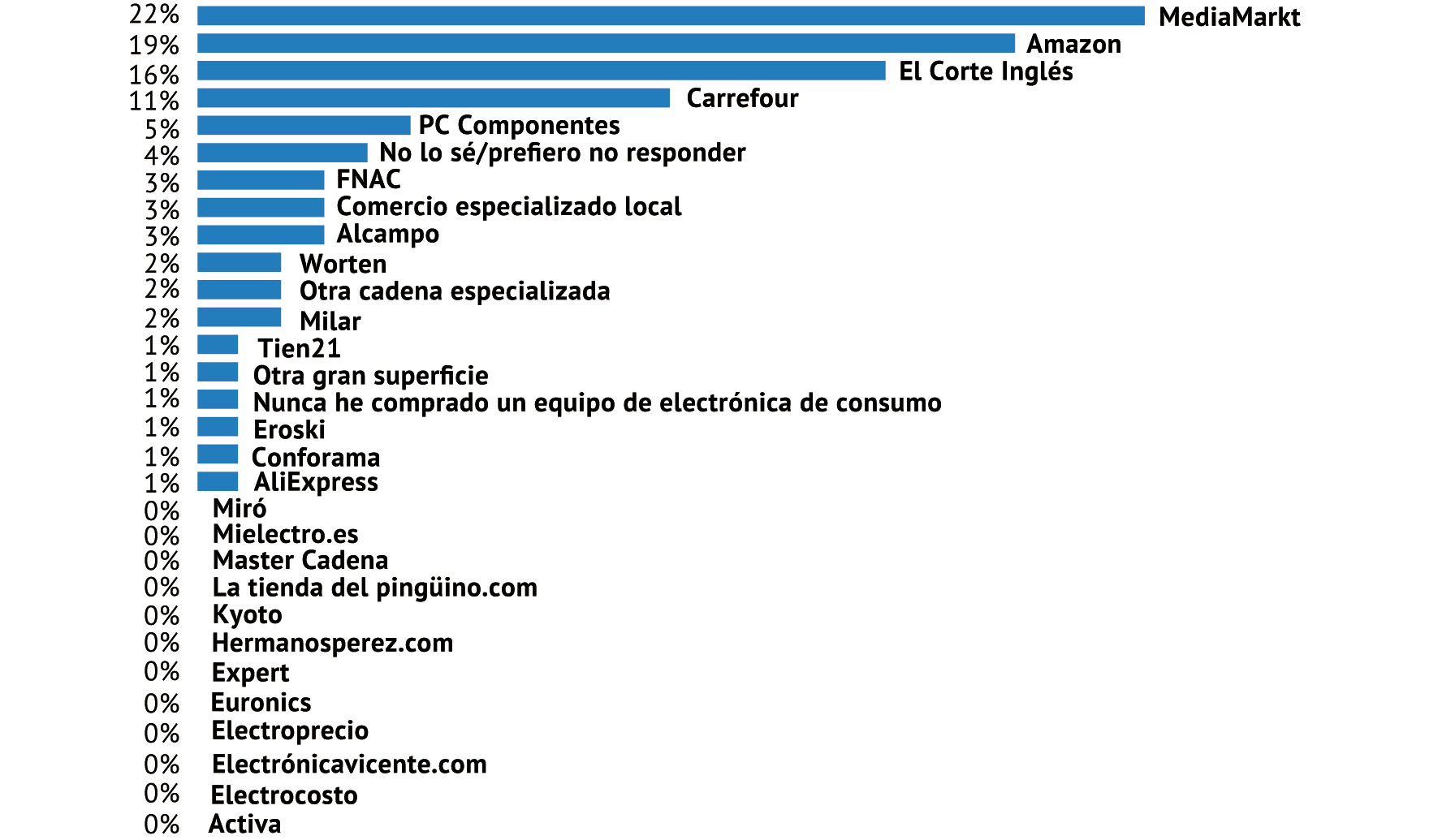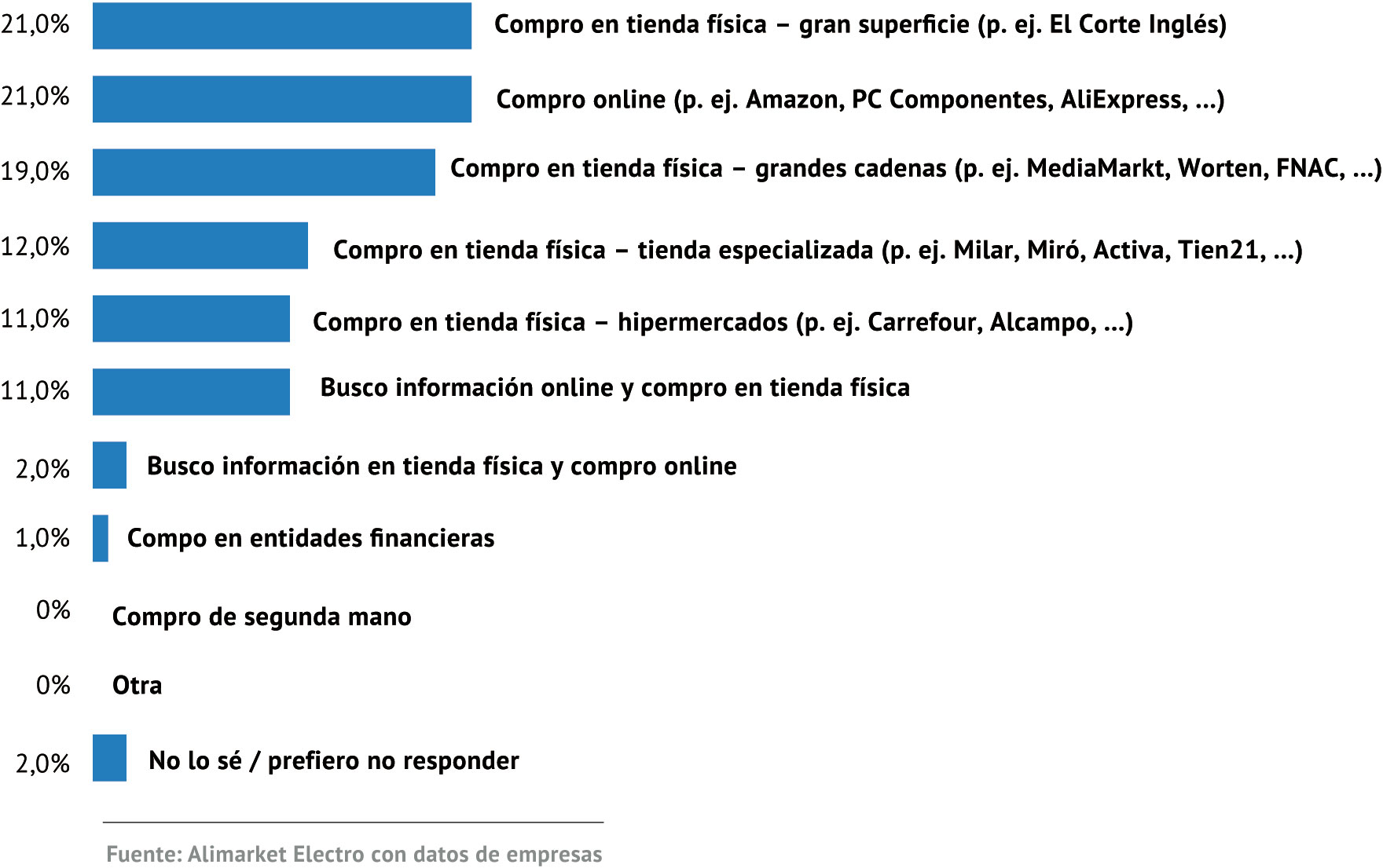 Según la encuesta de YouGov para Alimarket Electro, en el consumidor español prevalece la compra en tienda física, fundamentalmente grandes superficies y cadenas, donde destaca MediaMarkt, El Corte Inglés y Carrefour. Destaca la entrada en segunda posición del principal pure player Amazon, que hace dos años ocupaba la cuarta posición, con un 5%. El canal online cada vez gana más peso en el mercado español.