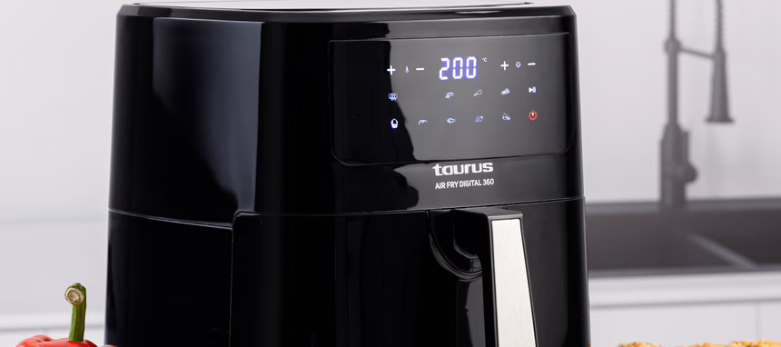 Taurus amplía su familia de freidoras de aire el lanzamiento de su nuevo modelo Air Fry Digital 360º, un modelo que incluye una doble resistencia arriba y abajo para cocinar más rápido y sin remover la comida durante la cocción. La freidora de aire sin aceite Air Fry Digital 360º cuenta con doble resistencia, arriba y abajo, para una cocción de 360º, lo que permite cocinar en la mitad de tiempo, más cantidad de alimentos y de forma más uniforme sin necesidad de extraer la cubeta y remover durante la cocción. Gracias a sus 7,5 litros de capacidad es perfecta para freír hasta 1500 gramos de patatas de una sola vez y en la mitad de tiempo. Este modelo permite ajustar la temperatura entre 50ºC y 200ºC para adecuarla a cada alimento, con temporizador de hasta 60 minutos y pantalla digital táctil con 10 programas predefinidos: precalentar, patatas fritas, carne, alitas y muslos, chuletón, repostería, marisco, pescado, pollo entero y verduras. Air Fry Digital 360, como el resto de las freidoras de aire sin aceite de Taurus, cuenta con la tecnología Air System Technology, un sistema de circulación de aire que permite obtener una temperatura constante y un reparto del calor homogéneo en el interior de la freidora, consiguiendo así frituras rápidas, doradas y homogéneas. Además, este sistema de calentamiento permite freír los alimentos sin aceite, para que puedas disfrutar de unos platos igual de sabrosos, pero con hasta un 99% menos de grasas.